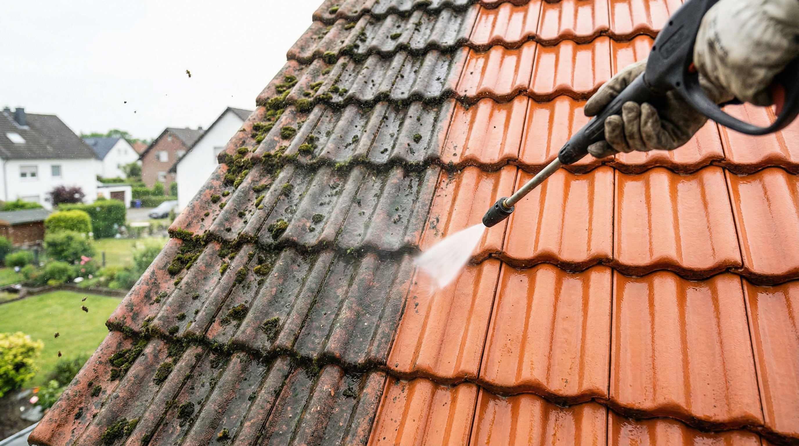 Professionelle Dachreinigung ab 999 € – die wirtschaftliche Alternative zur Neueindeckung. Mit Hochdrucktechnik und optionaler Beschichtung verlängern wir die Lebensdauer Ihres Daches um Jahre.