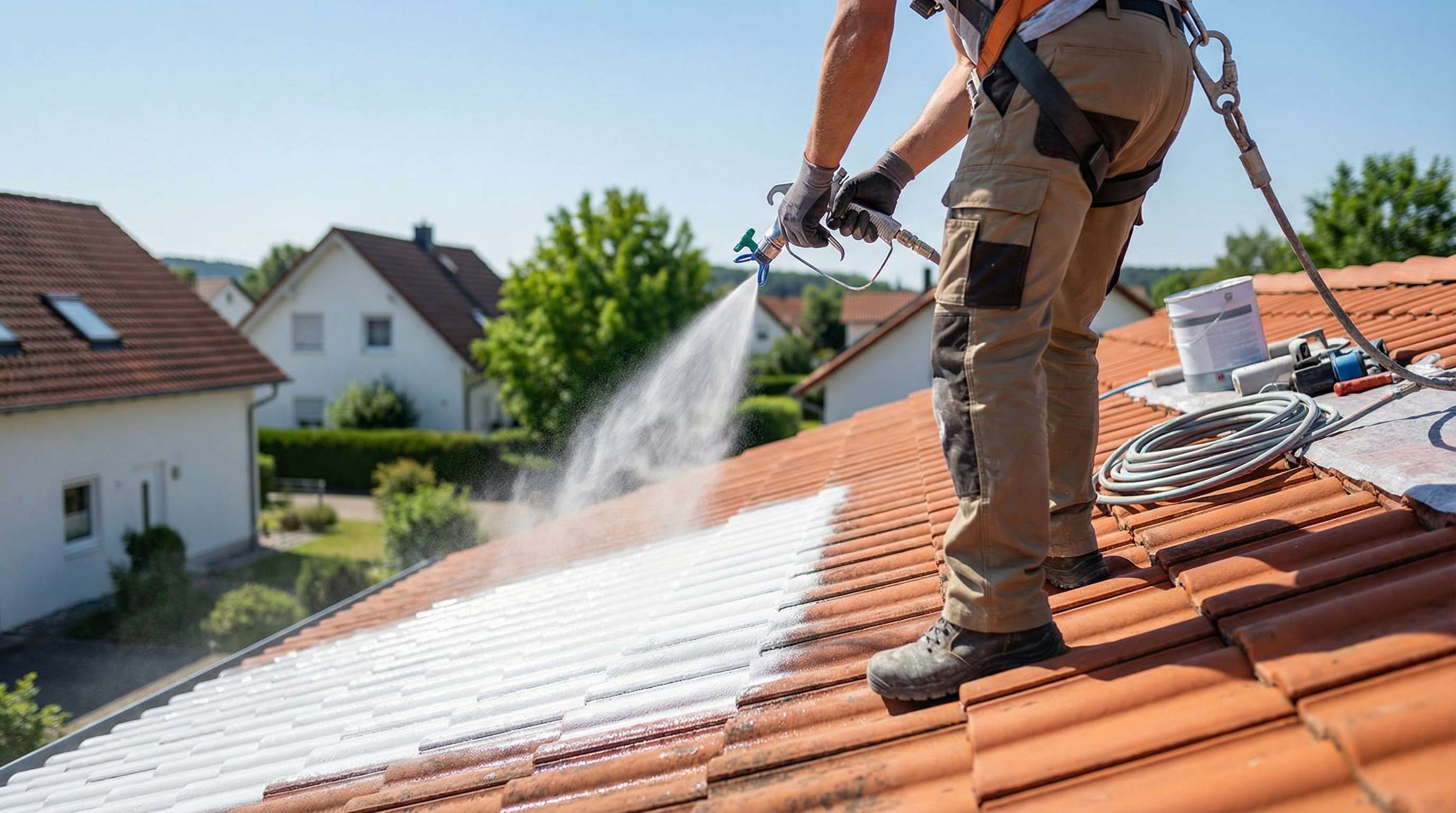 Unser 4-Schritte-Verfahren umfasst Reinigung, Desinfektion, Spezialgrundierung und hochwertige Farbbeschichtung. Je nach Dachtyp verwenden wir Acrylmischungen, Polyurethane oder moderne Nano-Beschichtungen mit Lotus-Effekt für optimalen Schmutz- und Wasserabperleffekt.